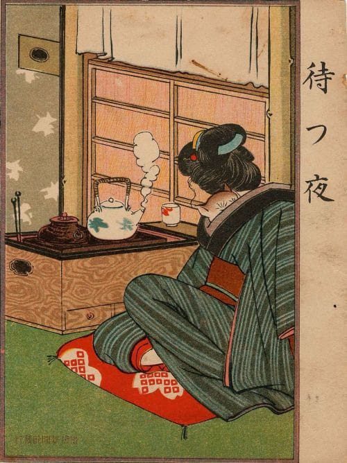 . A Meiji időszak #Japán -jában Ehagaki Sekai (1908, a metszet címe: Egy várakozás éjszakája.) #teával képzelte el a várakozást.