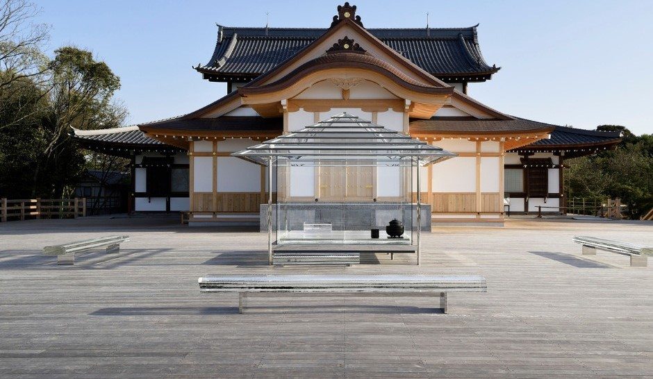 Tokujin Yoshioka tervezte, a Shoren-in templon teraszán álló teljesen üveg építmény, a Kyoto környéki Higashiyama hegyekre és völgyeire néz.