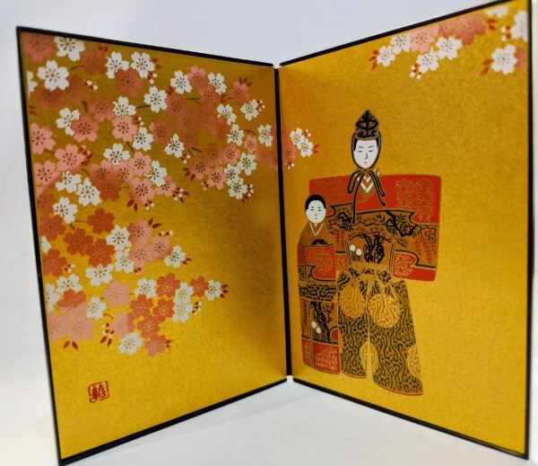 Ez a kisméretű japán paraván a Hinamatsuri – a Lányok Ünnepe finom, ünnepélyes világát idézi meg.