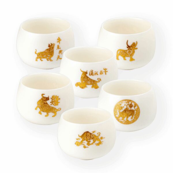 A csészék finom fehér alapszínén arany relief rátét díszítés fut végig, amely nemcsak esztétikailag lenyűgöző, hanem a hagyományos kínai művészet és szimbolika szerves része is. A készlet legmarkánsabb motívuma az arany bika ábrázolás, amely az erőt, kitartást és bőséget jelképezi, tökéletesen illeszkedve a bőségszarv tematikájához.