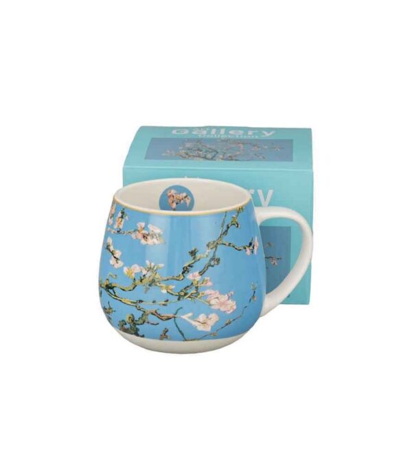 Ez a 430 ml-es, hordó formájú porcelán bögre Vincent van Gogh különleges, keleties hangulatú műve, a Mandulavirágok motívuma előtt tiszteleg. A festmény jellegzetes, élénk türkiz–égszínű háttere és a finoman kibomló fehér-rózsaszín virágágak tapinthatóan hordozzák Van Gogh lírai hangulatát és ecsetkezelésének energiáját.