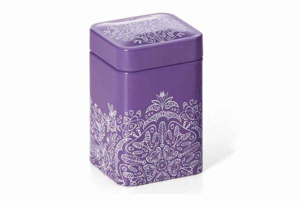 Ez a lila, mandala mintás fém teadoboz a tárolás funkcióját finom vizuális renddé emeli.